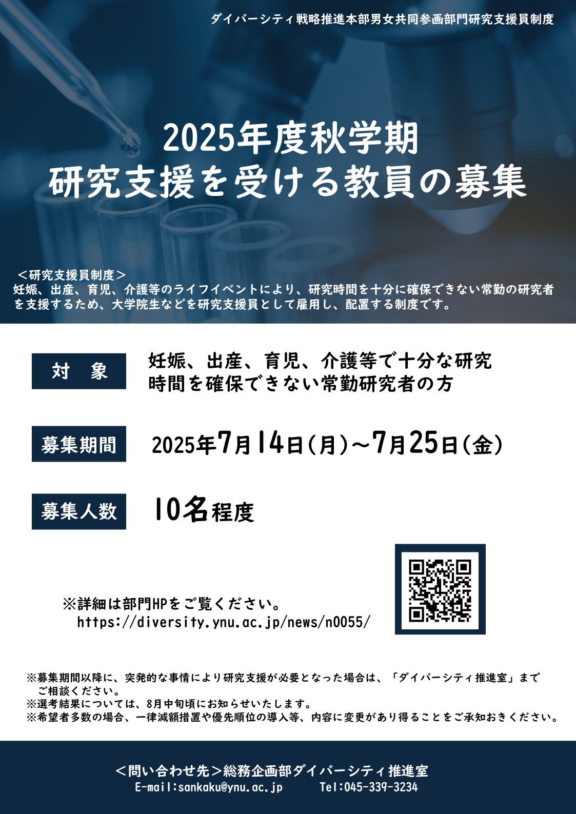 「国立大学法人横浜国立大学研究支援員制度実施要項」にもとづき、下記の通り、2025年度秋学期につきましても、研究支援を受ける教員を募集します。